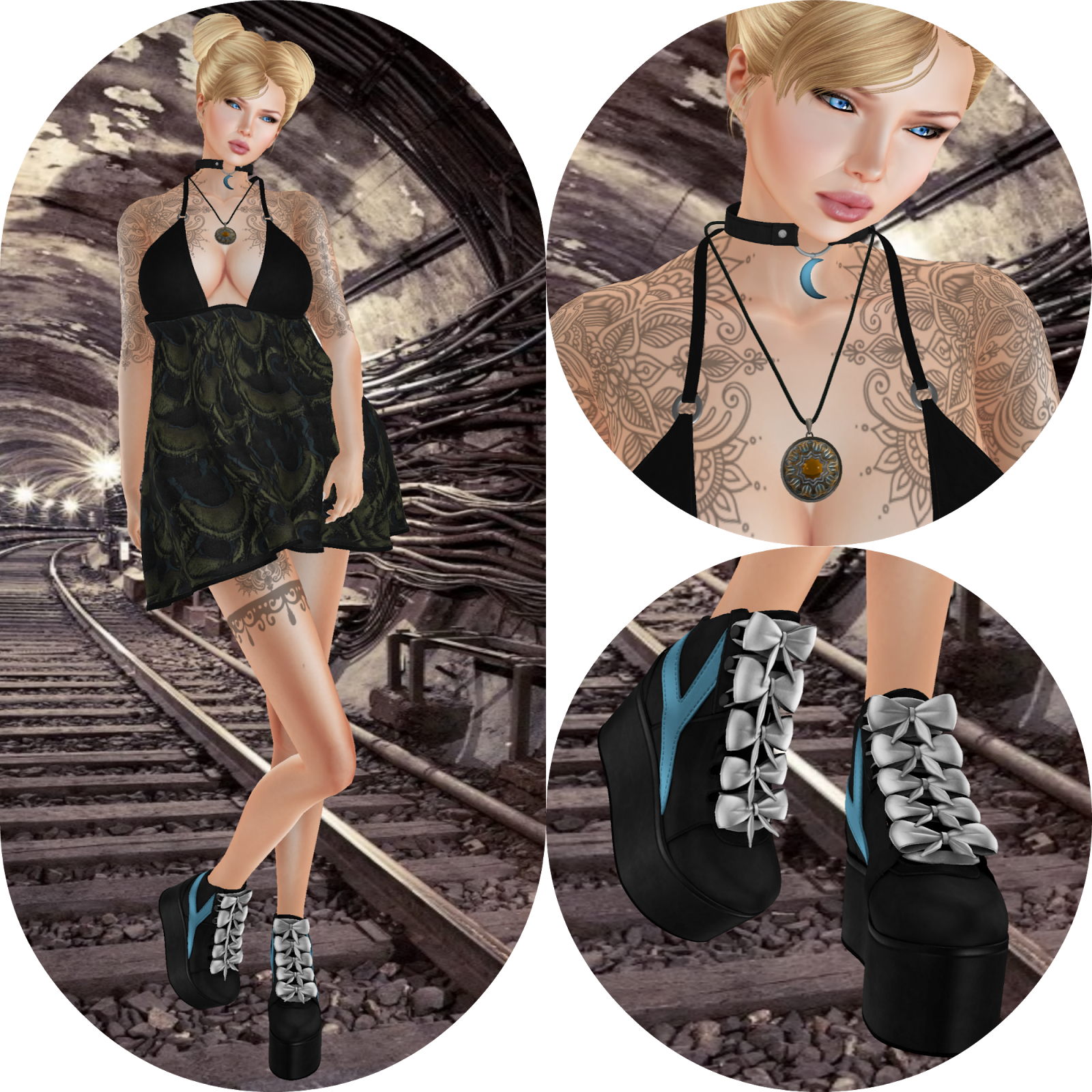 Yayy!! The week is finally on a Friday. Boy am I excited! That doesn't stop me from showing ya'll some awesome stuff. Starting with this amazing halter dress from Delirium Style. It is called Tiana Halter Mini and as you guessed by it's name it is a mini halter dress. It comes in 5 standard mesh sizes and 2 Belleza sizes, but I made it work for my Slink body. It comes with an amazing texture HUD that as you guessed changes the texture of the dress. So you can choose 1 of 10 styles, but I am showing ya'll the peacock inspired print. The moon collar I am wearing is also from Delirium Style and is called, Moon Collar. It is a thick black band collar with a chair to connect it around with a moon hanging down. It also comes with a color changing HUD so you can change that moon to work with any outfit you are wearing. Next up is the pendant I am wearing. That is another Delirium Style creation and is called, Magical Pendant. It is a necklace with a pretty good size not overwhelming pendant on the end. It too comes with a texture HUD so you can change it to fit you. Now the shoes I am showing ya'll is also from Delirium Style and they are called Baby Sneaks. They actually remind me of Baby Spice from the Spice Girls, her shoes. (Yes I realize I am old.) They are platform sneakers with bows instead of laces. The shoes are made for Belleza, Maitreya, and Slink Flat feet. They also have a color HUD. You are not only able to change the bows but everything but the soles of the shoes. All these items from Delirium Style are exclusive to The Dark Style Fair 3. It runs from May 14th, 2016 until June 4th, 2016. The hair I used to tie this whole look together is from Rezology and is called Lighting Legs. It is inspired by Chung Lee's hair from Street Fighter. So it is 2 buns high on your head with bangs hanging to the side. Like all Rezology hair this one does have a color HUD so you can change your hair to whatever color you would like because the color spectrum is pretty wide.