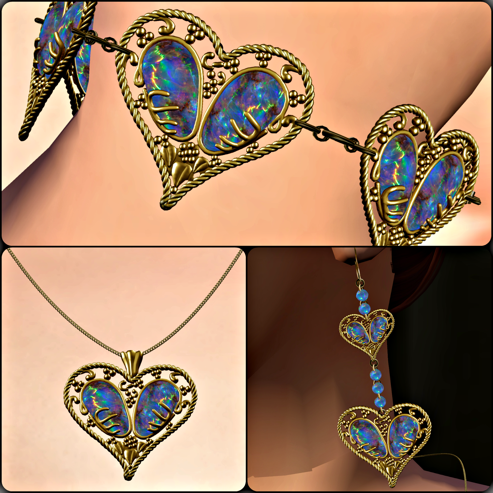 With Valentine's Day only a few hours away for me I decided why not showcase an amazing wedding dress and beautiful jewelry that will for sure make anyone at your wedding jealous. First us is the gown, it is from +Facepalm+ and is called, Gianna's Wedding. It is a white strapless corset with a long skirt that has a short train. It comes in 5 standard mesh sizes plus Slink, Belleza, Maitreya, and TMP. It also includes matching white pumps which comes in Maitreya, Belleza, TMP and Slink medium sizes. Now on to the jewels. They are from Zuri's Jewelry and is called Tender Heart. It features a bracelet, earrings, and a matching pendant necklace. This one that I am wearing is gold with blue fire opal. The hearts on them remind me of an old style tender box and are truly stunning and unique to anything I have ever seen. It does come in 4 other combinations that you will have to see to believe. It is a special set just for Valentine's Day.